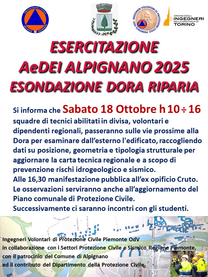 2025 10 Esercitazione “AeDEI Alpignano 2025 – Esondazione Dora Riparia” Venerdì 17: formazione sulla scheda sperimentale di Agibilità e Danno Emergenza meteo-Idro-geo con la partecipazione del DPC e inquadramento idrogeologico del territorio; Sabato 18: Sopralluoghi AeDEI sulle sponde della Dora Riparia con volontari IVPCP, AIB e AIVEM Lazio + dipendenti Regioni Piemonte e Liguria e Comune di Alpignano.